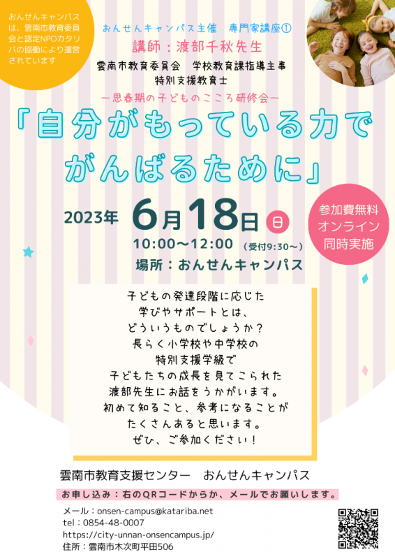 雲南市教育支援センター「おんせんキャンパス」とは、学校での生活に不安や戸惑いを抱えている、学校へ通うことに困難さをお持ちの子どもやそのご家族のためのサポート機関です。雲南市教育委員会と認定非営利活動法人カタリバの協働により運営しており、原則として雲南市の子どもを対象としています。